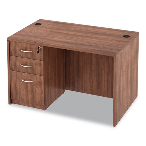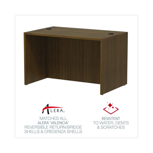 Product Details** Global Product Type Desk Shells Worksurface Shape Rectangular Color Family Walnut Pedestal Count 0 Keyboard/Mouse Platform Indicator No CPU Holder/Platform Indicator No Number of Drawers 0 Series Name Alera® Valencia™ Series Worksurface/Base Color Modern Walnut Worksurface Material Woodgrain Laminate Worksurface Thickness 1″ Edge Detail Profile 3 mm Protective Edge Band Base Material Woodgrain Laminate Overall Width (Max) 47.25″ Overall Depth (Max) 29.5″ Overall Height (Max) 29.63″ Number of Shelves 0 Caster/Glide/Wheel Four Leveling Glides For Use With Alera® Valencia™ Series Reversible Return/Bridge Shells and Credenza Shells Product Biodegradability Indicator N Product Biodegradability in Days 0 Product Compostability Indicator N Compliance Standards Meets or Exceeds ANSI/BIFMA Standards Pre-Consumer Recycled Content Percent 0% Post-Consumer Recycled Content Percent 0% Total Recycled Content Percent 0% Country Of Origin CN Carton Weight 106 lbs. Carton Pack Quantity 1 EA Pack Quantity 0 UPC 042167305604 UNSPSC 56101703 Shipping Weight & Item Dimensions Weight 105.82 lbs. Length 59 in Height 4.75 in Width 32 in Warranty Manufacturer’s limited five-year warranty.