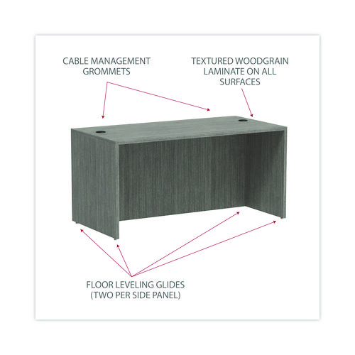 Product Details** Global Product Type Desk Shells Worksurface Shape Rectangular Color Family Gray Pedestal Count 0 Keyboard/Mouse Platform Indicator No CPU Holder/Platform Indicator No Number of Drawers 0 Series Name Alera® Valencia™ Series Worksurface/Base Color Gray Worksurface Material Woodgrain Laminate Worksurface Thickness 1″ Edge Detail Profile 3 mm Protective Edge Band Base Material Woodgrain Laminate Overall Width (Max) 59.13″ Overall Depth (Max) 29.5″ Overall Height (Max) 29.63″ Number of Shelves 0 Caster/Glide/Wheel Four Leveling Glides For Use With Alera® Valencia™ Series Reversible Return/Bridge Shell and Credenza Shell Product Biodegradability Indicator N Product Biodegradability in Days 0 Product Compostability Indicator N Compliance Standards Meets or Exceeds ANSI/BIFMA Standards Pre-Consumer Recycled Content Percent 0% Post-Consumer Recycled Content Percent 0% Total Recycled Content Percent 0% Country Of Origin CN Carton Weight 120 lbs. Carton Pack Quantity 1 EA Pack Quantity 0 UPC 042167000677 UNSPSC 56101703 Shipping Weight & Item Dimensions Weight 119.93 lbs. Length 64.96 in Height 4.7 in Width 32.28 in Warranty Manufacturer’s limited five-year warranty.