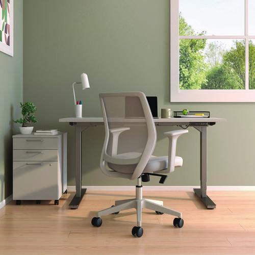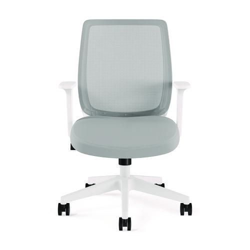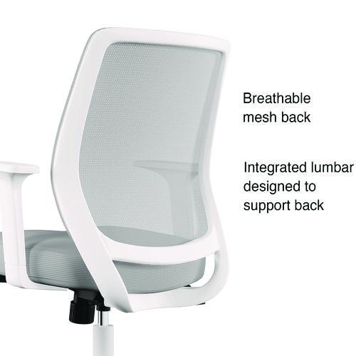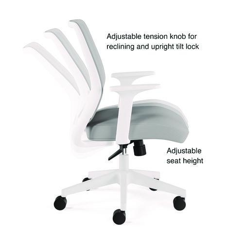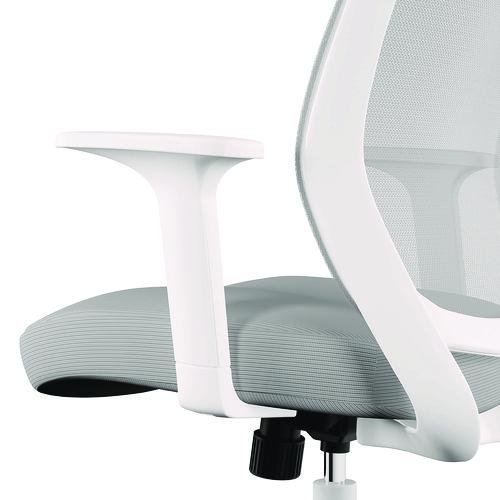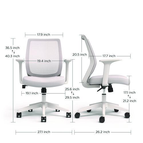 Product Details** Global Product Type Office Chairs Color Family Gray Arms Included Yes Pneumatic Seat Height Adjustment Yes Tilt Tension/Tilt Lock Yes Integral Lumbar Support No Seat Surface Material Family Fabric Recommended Application Area(s) General Office & Task Seat Color Gray Back Color Gray Arm Type T-Bar Weight Capacity Supports Up to 275 lb Seat Glide Mechanism No Knee Tilt No Synchronized Knee Tilt No Dual-Action Tilt No Posture Lock No Multi-Task Control No Asynchronous Control No Dual-Clutch Posture Control No Variable Synchro-Tilt No Arm Adjustability Height Armrest Color White Armrest Material Nylon Distance Between Arms 19.41″ Overall Width Maximum 27.09″ Overall Depth Maximum 26.18″ Overall Height Minimum 36.54″ Overall Height Maximum 40.28″ Seat Width Maximum 19.09″ Seat Depth Maximum 17.72″ Seat Height Minimum 17.09″ Seat Height Maximum 20.83″ Seat Surface Material Fabric Seat Fill Material Foam Back Width Maximum 17.91″ Back Height Maximum 20.47″ Back Surface Material Mesh Back Surface Material Family Mesh Base/Frame Color White Base/Frame Material(s) Nylon Caster/Glide Details Five Nylon Casters Caster/Glide Surface Texture Hard Compatible Flooring Type(s) Carpet,Hard Floor Book Box Indicator No Weight (Fully Assembled) 28 lbs Product Biodegradability Indicator N Product Biodegradability in Days 0 Product Compostability Indicator N Compliance Standards Meets or Exceeds ANSI/BIFMA Standards Pre-Consumer Recycled Content Percent 0% Post-Consumer Recycled Content Percent 0% Total Recycled Content Percent 0% Country Of Origin VN Carton Weight 28 lbs. Carton Pack Quantity 1 EA Pack Quantity 0 UPC 042167001995 UNSPSC 56101720 Shipping Weight & Item Dimensions Weight 28.003 lbs. Length 24.803 in Height 12.598 in Width 23.425 in Warranty Manufacturer’s limited five-year warranty.