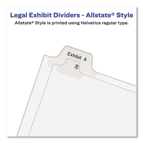 Product Details** Global Product Type Printed Exhibit Alpha Index Dividers Index Divider Style Legal Alpha Tab Orientation Side Tab Tab Style 26-Tab Color Family White Punched/Unpunched Unpunched Index Divider Size 11 x 8.5 For Use With Comb Binding Systems Index Divider Material(s) Heavyweight Ledger Paper Index Divider Color(s) White Tab Material(s) Heavyweight Ledger Paper Tab Color(s) White/Clear Lamination Legal Tab Style Allstate® Style Tab Title(s) Exhibit G Tab Title Color(s) Black Index Divider Form Quantity 25/Pack Product Biodegradability in Days 0 Green Information PVC-free. Pre-Consumer Recycled Content Percent 0% Post-Consumer Recycled Content Percent 0% Total Recycled Content Percent 0% Country Of Origin MX Carton Weight 9 lbs. Carton Pack Quantity 20 PK Pack Quantity 25 EA UPC 072782821135 UNSPSC 44122008 Shipping Weight & Item Dimensions Weight 0.4 lbs. Length 10.7 in Height 0.2 in Width 8 in