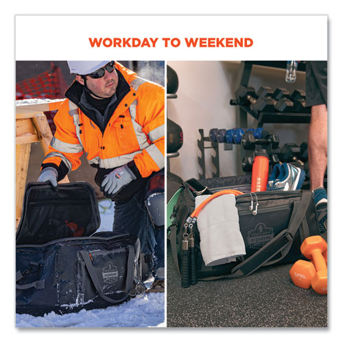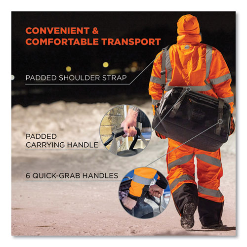 The Arsenal 5031 Water-Resistant Duffel Bag is built tough to withstand harsh conditions, with heavy-duty cold- and water-resistant tarpaulin and 600D coated polyester to keep gear dry and protected in any season. Durable zippers on the top clamshell opening are also covered by an overhang to prevent water from leaking inside. A padded shoulder strap and top handle makes it comfortable to transport heavy gear, while six handles around the sides allow for quick loading and unloading no matter which way the bag is faced. A thick reinforced base provides added protection and support to hold the bag’s shape even when empty. The large clamshell compartment opens wide for convenient access when packing or unpacking, while the squared shape of the bag helps maximize storage space. For accessory storage and organization, the main compartment features a mesh zippered top pocket, a large zippered side pocket and three elastic side pockets.