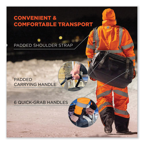 The Arsenal 5031 Water-Resistant Duffel Bag is built tough to withstand harsh conditions, with heavy-duty cold- and water-resistant tarpaulin and 600D coated polyester to keep gear dry and protected in any season. Durable zippers on the top clamshell opening are also covered by an overhang to prevent water from leaking inside. A padded shoulder strap and top handle makes it comfortable to transport heavy gear, while six handles around the sides allow for quick loading and unloading no matter which way the bag is faced. A thick reinforced base provides added protection and support to hold the bag’s shape even when empty. The large clamshell compartment opens wide for convenient access when packing or unpacking, while the squared shape of the bag helps maximize storage space. For accessory storage and organization, the main compartment features a mesh zippered top pocket, a large zippered side pocket and three elastic side pockets.