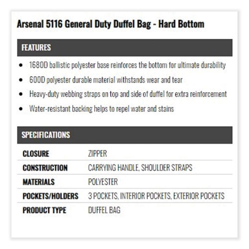 The Arsenal 5116 General Duty Gear Bag is a spacious bag with three compartments to keep everything you need for the workday or the weekend organized. Whether you use it as a way to store your equipment on the job, a hunting bag to trek your gear through the woods, or as a carry-on duffel bag while traveling, you can rely on this utility duffel bag to house and protect your valuables. This gear bag is super durable made with 600 denier polyester material to withstand wear and tear for long-lasting performance. The bottom is reinforced with a 1680 denier polyester. Keep your essentials clean and dry with the reinforced water-resistant backing. Ribbed webbing handles and adjustable padded shoulder straps. A large open main compartment fits all your gear with easy loading and unloading, so nothing is left behind. There are two accessory pockets with zippers on each side to hold smaller items.