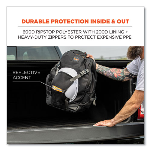 The Arsenal 5188 Work Gear Jobsite Backpack makes for easy transport and storage of work gear on and off the worksite, including hard hats, fall protection, safety vests and more. Built to protect with 600D ripstop polyester and 200D nylon lining, plus padded shoulder straps and back for comfort when transporting heavy gear. Heavy-duty zippers secure your contents inside the gear backpack, while exterior pockets provide additional storage for smaller PPE (such as eyewear) and personal items. The water bottle pocket fits most bottle sizes. The heavy-duty work backpack is ideal for protecting and transporting daily use gear, particularly for workers regularly traveling to different job sites in industries such as construction, oil and gas, mining, telecommunications and more.