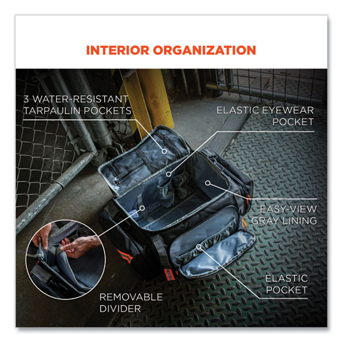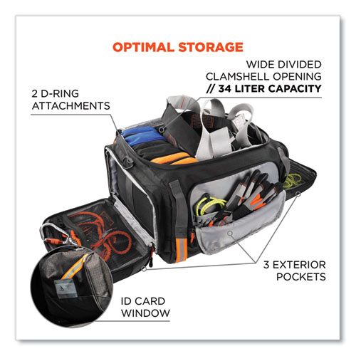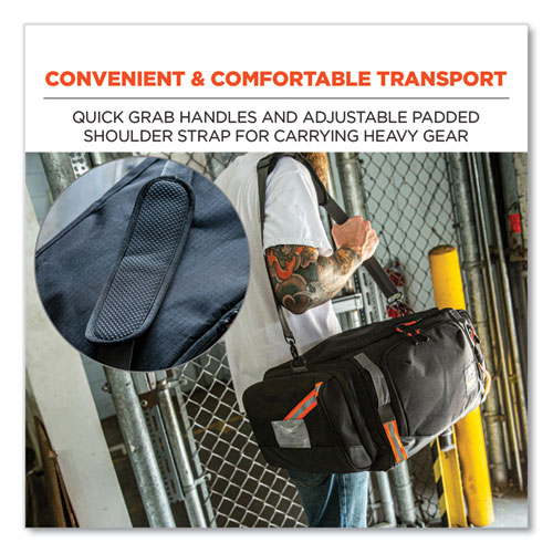 The Arsenal 5189 Work Gear Duffel Bag makes for easy transport and storage of work gear on and off the worksite, including hard hats, fall protection, safety vests and more. Built to protect with 600D ripstop polyester and 200D nylon lining, plus a padded shoulder strap for comfort when transporting heavy gear. The interior compartment is strategically designed with a variety of dividers and pockets for convenient gear organization. In addition to large capacity for storing all the essentials, the main clamshell compartment features an internal divider plus elastic pockets for eyewear and water-resistant tarpaulin pockets. Three exterior side pockets provide extra storage, while an ID card window holds business cards and jobsite IDs for easy identification. Featuring reflective striping for enhanced visibility.