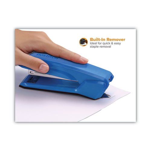 Product Details** Global Product Type Full-Size Desktop Staplers High Capacity Stapling No Flat Clinch Plate No Power Source(s) Manual Tacking Yes Color Family Blue Staple Loading Top Staple Capacity Full Strip (210 Staples) Type of Staple Used Standard Sheet Capacity 20 Replacement Staples Bostitch® SBS191/4CP Leg Size 0.25″ Crown Size 0.5″ Color(s) Ice Blue Material(s) Plastic,Metal,Rubber Throat Depth 3.63″ Product Biodegradability Indicator N Product Biodegradability in Days 0 Product Compostability Indicator N Package Includes (420) Staples Pre-Consumer Recycled Content Percent 0% Post-Consumer Recycled Content Percent 70% Total Recycled Content Percent 70% Footnote 1 All sheet capacities are based on 20-lb. bond Country Of Origin CN Carton Weight 10 lbs. Carton Pack Quantity 6 EA Pack Quantity 0 UPC 077914056768 UNSPSC 44121615 Shipping Weight & Item Dimensions Weight 0.25 lbs. Length 8.66 in Height 1.57 in Width 3.39 in Warranty Manufacturer’s limited lifetime warranty.