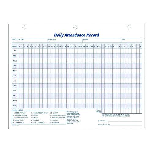 Keep track of vacation time, PTO and sick days with these attendance records. The letter-size prepunched sheets fit neatly in binders or personnel folders, while the preprinted forms make it easy to enter information about each missed day of work. A 12-month layout provides space for a whole year’s worth of attendance. With an absence code key, these Adams® daily attendance records offer a simple way to designate time off.