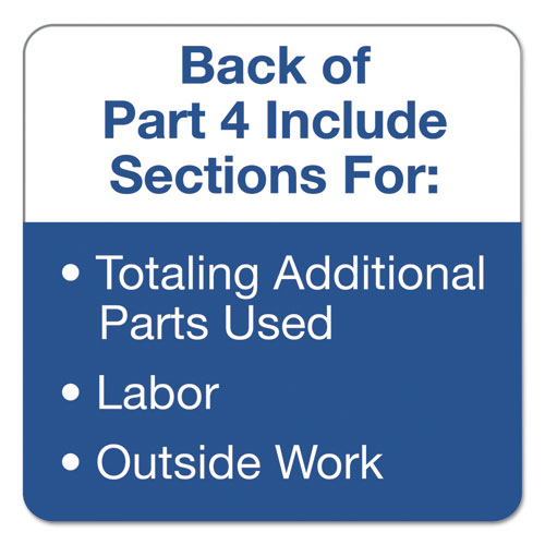 Use to detail customer information, instructions and parts required. The back of every copy includes sections for totaling additional parts used, labor and outside work. Four parts: office copy, customer copy, estimate copy and manila tag shop copy. Carbonless black-print copies.