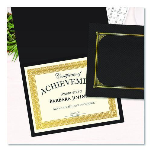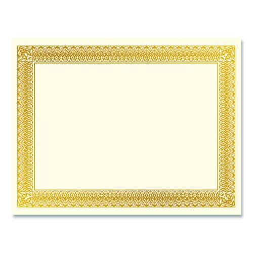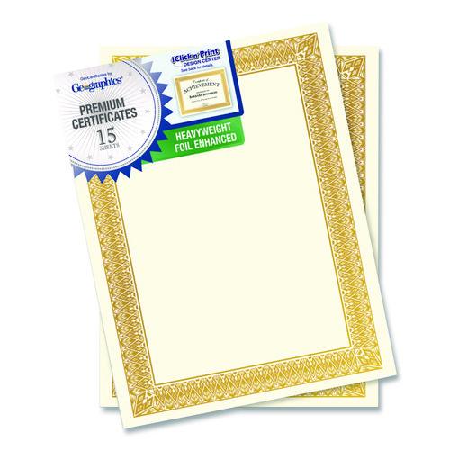Product Details** Global Product Type Printable Certificates Shape Rectangular Color Family Beige Paper Basis Weight (lb) 65 lb Bond Theme Elegant Color(s) Ivory Border Color(s) Gold Width 8.5″ Height 11″ For Use With Geographics® Certificate/Document Cover: Black, Black Tree Free, Metallic Bluer, Navy Blue, Navy Blue Tree Free Product Biodegradability Indicator N Product Biodegradability in Days 0 Product Compostability Indicator N Pre-Consumer Recycled Content Percent 0% Post-Consumer Recycled Content Percent 0% Total Recycled Content Percent 0% Country Of Origin CN Carton Weight 2 lbs. Carton Pack Quantity 10 PK Pack Quantity 15 EA UPC 071064478296 UNSPSC 49101705 Shipping Weight & Item Dimensions Weight 1 lbs. Length 0.4 in Height 11.25 in Width 8.75 in
