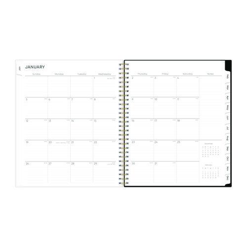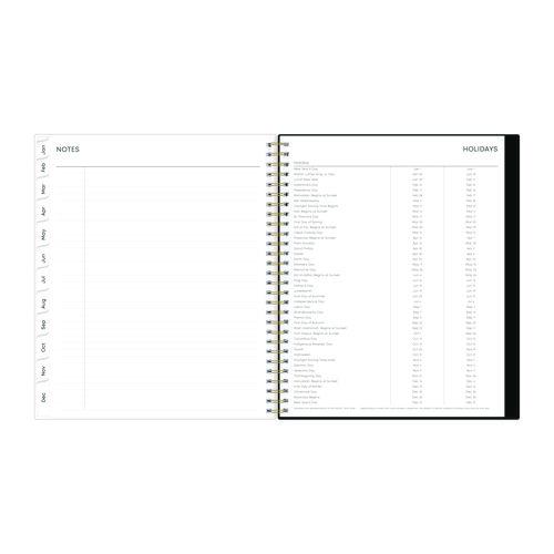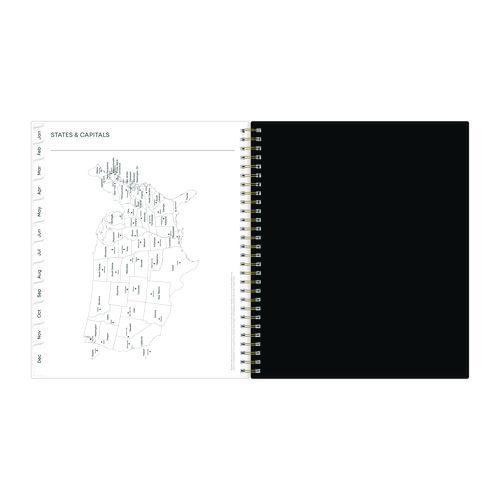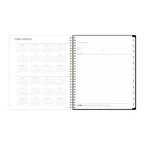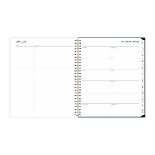 Get ahead with this stunning black and gold floral planner in the “Baccara Dark” design, and stay on top of your monthly plans with stylish flair! Two-page per month spreads offer a visual overview of your time. A separate Yearly Goals page, Contacts pages, Notes pages, Important Dates page and four years of Holidays help you remain poised to tackle whatever may come.