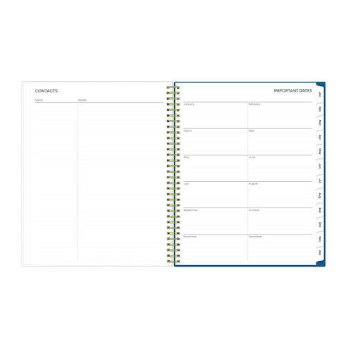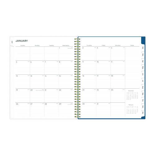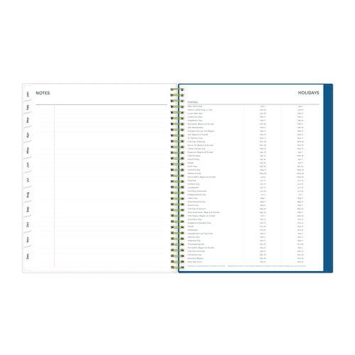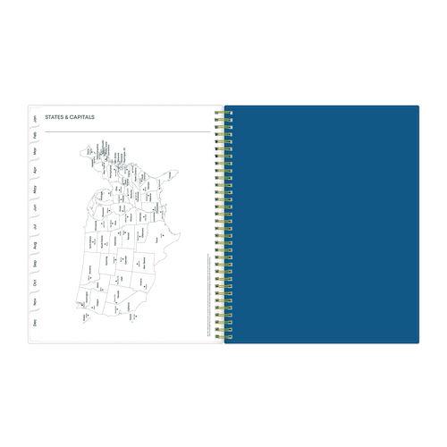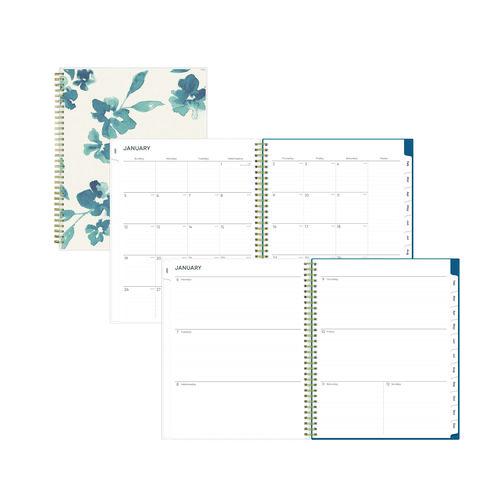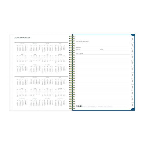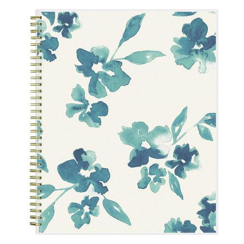 Soothing pastels bring peace to your busy schedule with their graceful blue florals on a cream background to frame your plans with elegance, accented in yellow gold. Two-page per week spread features lined daily blocks. Monthly view per two-page spread includes a Notes section for important projects. Monthly tabs are coated for durability. Durable, frosted flexible front cover. Twin-wire binding offers easy page turning. Includes pages for Yearly Goals, Contacts, Reference Calendars, and extra Notes pages. Thick, premium quality pages reduce ink bleed-through. Includes six bonus past monthly views for easy yearly transition (July-Dec.).