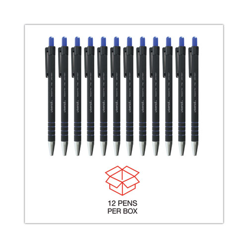 Product Details** Global Product Type Ballpoint Pens Pen Style Retractable Pen Tip Type Conical Pen Point Size Type Fine Color Family Blue Erasable Ink No Refillable No Pen Type Ballpoint Pen Pen Point Size 0.7 mm Pen Ink Color(s) Blue Pen Barrel Color(s) Blue Permanent/Washable Ink Permanent Airplane-Safe Ink Yes Low-Viscosity Ink No Special Ink Properties Water-Resistant Pen Grip Type Rubber Visible Ink Supply No Pocket Clip Indicator Yes Product Biodegradability in Days 0 Pre-Consumer Recycled Content Percent 0% Post-Consumer Recycled Content Percent 0% Total Recycled Content Percent 0% Country Of Origin CN Carton Weight 5 lbs. Carton Pack Quantity 24 DZ Pack Quantity 0 UPC 087547155219 UNSPSC 44121704 Shipping Weight & Item Dimensions Weight 0.18 lbs. Length 5.51 in Height 0.75 in Width 2.64 in Warranty Manufacturer’s limited one-year warranty.