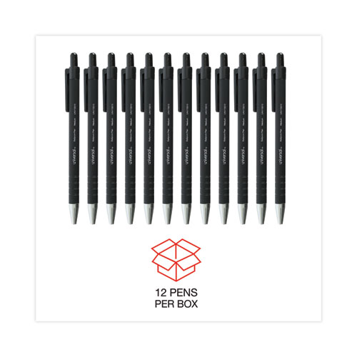 Product Details** Global Product Type Ballpoint Pens Pen Style Retractable Pen Tip Type Conical Pen Point Size Type Medium Color Family Black Erasable Ink No Refillable No Pen Type Ballpoint Pen Pen Point Size 1 mm Pen Ink Color(s) Black Pen Barrel Color(s) Black Permanent/Washable Ink Permanent Airplane-Safe Ink Yes Low-Viscosity Ink No Special Ink Properties Water-Resistant Pen Grip Type Rubber Visible Ink Supply No Pocket Clip Indicator Yes Product Biodegradability in Days 0 Pre-Consumer Recycled Content Percent 0% Post-Consumer Recycled Content Percent 0% Total Recycled Content Percent 0% Country Of Origin CN Carton Weight 5 lbs. Carton Pack Quantity 24 DZ Pack Quantity 0 UPC 087547155103 UNSPSC 44121704 Shipping Weight & Item Dimensions Weight 0.18 lbs. Length 5.51 in Height 0.75 in Width 2.64 in Warranty Manufacturer’s limited one-year warranty.