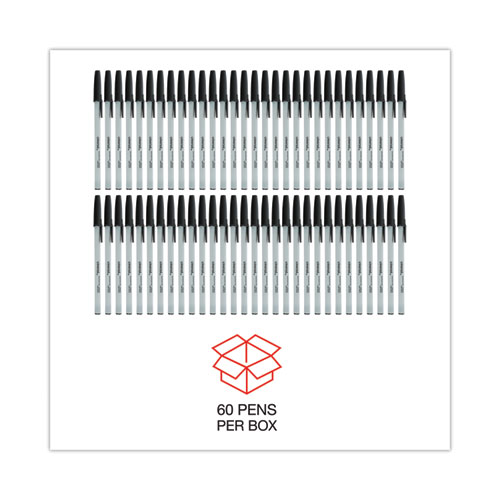 Product Details** Global Product Type Ballpoint Pens Pen Style Stick Pen Tip Type Conical Pen Point Size Type Medium Color Family Black Erasable Ink No Refillable No Pen Type Ballpoint Pen Pen Point Size 1 mm Pen Ink Color(s) Black Pen Barrel Color(s) Gray/Black Pen Cap Color(s) Black Airplane-Safe Ink Yes Low-Viscosity Ink No Pen Grip Type Smooth Visible Ink Supply No Pocket Clip Indicator Yes Product Biodegradability in Days 0 Pre-Consumer Recycled Content Percent 0% Post-Consumer Recycled Content Percent 0% Total Recycled Content Percent 0% Special Features Value Pack—Stock up and save! Country Of Origin IN Carton Weight 21 lbs. Carton Pack Quantity 24 PK Pack Quantity 60 EA UPC 087547156131 UNSPSC 44121704 Shipping Weight & Item Dimensions Weight 0.76 lbs. Length 6.14 in Height 3.07 in Width 3.07 in Warranty Manufacturer’s limited one-year warranty.