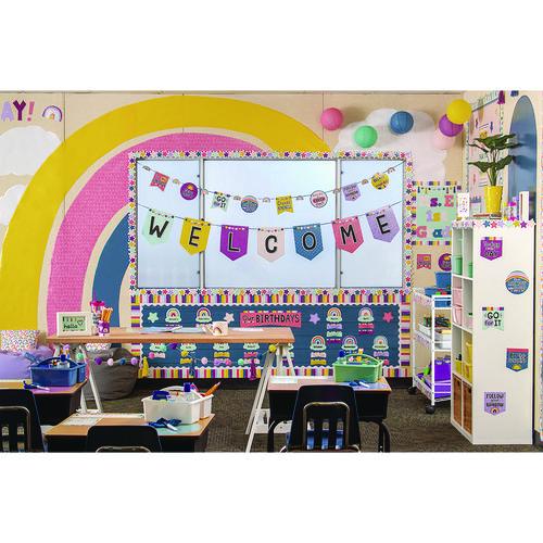 Create beautiful bulletin board backdrops quickly and easily! This lightweight material is simple to hang–no more struggling with paper that wrinkles and tears. Attach border trim, accents, posters, and student work with staples or tape and remove without ripping or leaving conspicuous holes. The durable write-on/wipe-off surface can be used again and again.