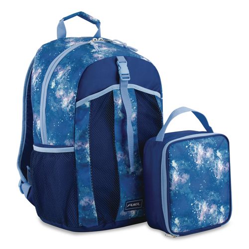 Product Details** Global Product Type Backpacks Wheels No Color Family Blue Color(s) Light Blue Galaxy Material(s) Polyester,Polyethylene Vinyl Acetate (PEVA),Polypropylene Carrying Handle Yes Shoulder Strap Indicator Yes Telescoping Handle No Belt Loop No Closure Type Zipper Locking (Yes/No) No Number of Compartments 5 Width 13.5″ Depth 7″ Height 18.5″ Product Biodegradability Indicator N Product Biodegradability in Days 0 Product Compostability Indicator N Package Includes (1) Backpack,(1) Lunch Bag Pre-Consumer Recycled Content Percent 0% Post-Consumer Recycled Content Percent 0% Total Recycled Content Percent 0% Footnote 1 Lunch Bag Dimensions: 7.5″ x 4.25″ x 9″ Country Of Origin MM Carton Weight 9 lbs. Carton Pack Quantity 6 EA Pack Quantity 0 UPC 091074016851 UNSPSC 53121603 Shipping Weight & Item Dimensions Weight 1.175 lbs. Length 17.945 in Height 3.027 in Width 14.109 in