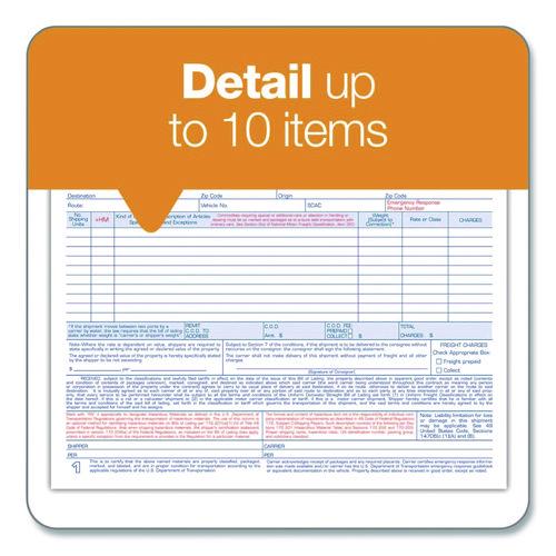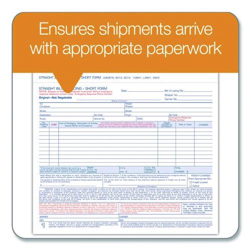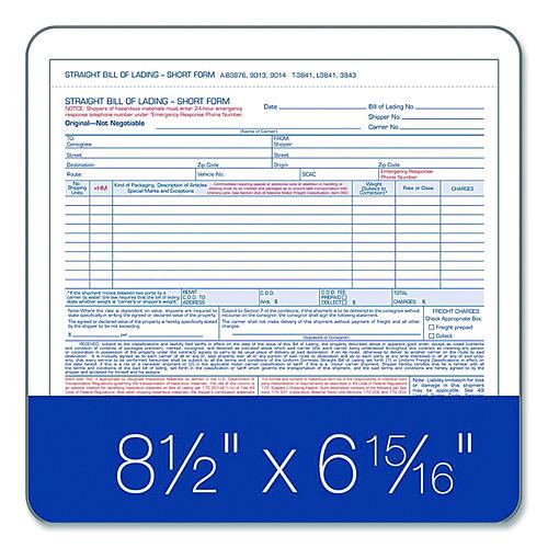Product Details** Global Product Type Shipping & Receiving Forms Form Type Details Shipping/Receiving Dated No Forms Per Page 1 Format Indicator Unbound Copy Types Three-Part Carbonless Color Family White Form Size 8.5 x 6.94 Sheet Size 8.5 x 7.45 Form Quantity (Total) 50 Principal Heading(s) Straight Bill of Lading – Short Form Columns per Sheet 6 Number of Entry Lines 10 Paper Color(s) White Copy Paper Color(s) White Paper Stock 15 lb Bond Print and Ruling Color(s) Blue/Red Numbering Customizable Top Right Product Biodegradability Indicator N Product Biodegradability in Days 0 Product Compostability Indicator N Pre-Consumer Recycled Content Percent 0% Post-Consumer Recycled Content Percent 0% Total Recycled Content Percent 0% Disclaimer Statement This product was made using wood sourced from a certified managed forest. Special Features For Up to Ten Articles Country Of Origin US Carton Weight 6 lbs. Carton Pack Quantity 7 PK Pack Quantity 50 EA UPC 087958090130 UNSPSC 14111809 Shipping Weight & Item Dimensions Weight 0.6 lbs. Length 0.6 in Height 7.5 in Width 8.7 in