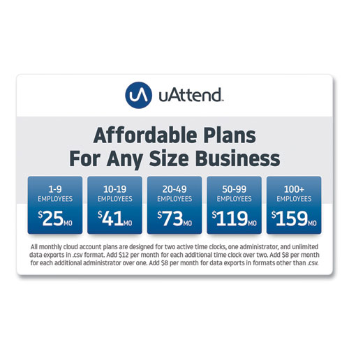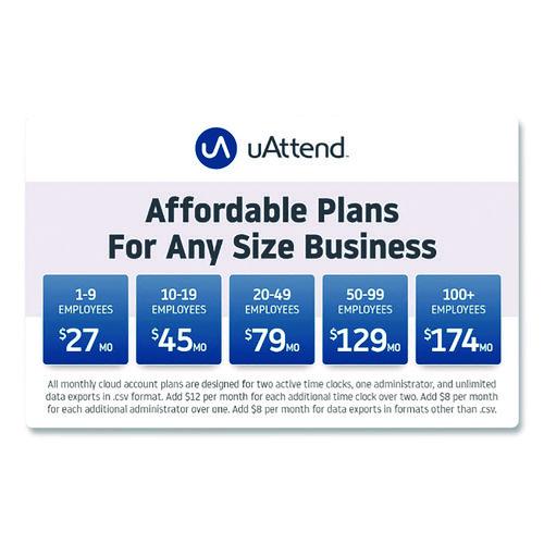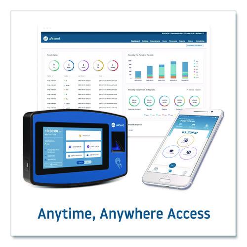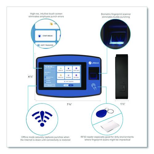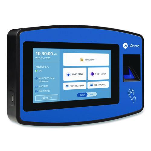 The uAttend NX2500 biometric fingerprint touch tablet time clock includes everything you need to effortlessly track time and attendance. The system offers multiple capabilities within one device, including a fingerprint scanner, RFID, PIN, and web browser punching, plus offline mode and easy Wi-Fi or LAN connection. This easy-to-use time clock offers support for an unlimited number of employees and departments, large touch-screen display, and biometric fingerprint scanner to help eliminate costly buddy punching. The time clock is Cloud-connected, so it automatically sends all time clock data to the Cloud in real time, where you can view it from any web browser. The Cloud lets you automate your timekeeping processes by letting you set up automatic rules for punch rounding, lockouts, breaks, overtime, and accruals to help you stay in line with compliance and accurately calculate your employees’ hours. Access dozens of reports with business insights and analytics, and export payroll reports to your payroll provider or directly to QuickBooks Desktop.