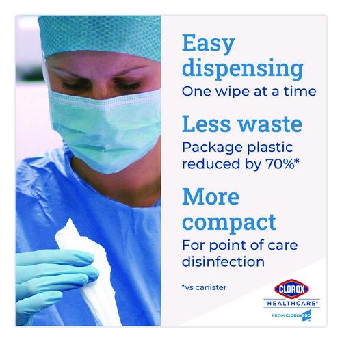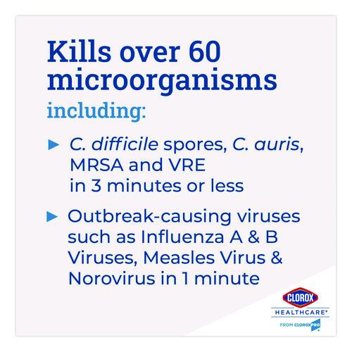 Your proven bleach solution for cleaning. Clorox Healthcare® Bleach Germicidal Wipes kill C. difficile and C. auris in three minutes and 58 other microorganisms in one minute or less, including outbreak causing viruses, emerging viral pathogens, MRSA and VRE when used as directed. With superior surface compatibility on a wide range of hospital surfaces, these disinfecting wipes help you cover more square footage per wipe with fast contact times and greater wetness surface coverage than the leading competitor. The phosphate free formula is optimized to be easy on surfaces and leaves less residue behind. Use in healthcare settings including hospitals, medical facilities, outpatient facilities and long term care facilities. Follow special instructions for cleaning prior to disinfection.