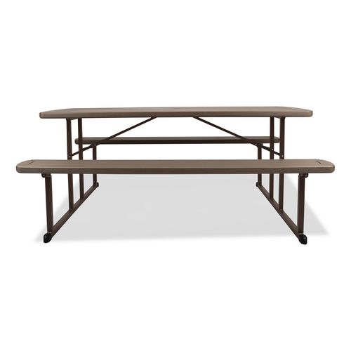 Product Details** Global Product Type Picnic Tables Top Shape Rectangular Color Family Brown Maximum Weight Capacity 1,000 lbs Overall Width 57″ Height (Max) 29.5″ Base Color Brown Top Color Brown Top Thickness 1.6″ Overall Depth 72″ Top Material Plastic Base/Leg Material Steel Base Type (4) Folding Legs Folded Height 3″ Caster/Glide/Wheel Non-Marring Glides Product Biodegradability Indicator N Product Biodegradability in Days 0 Product Compostability Indicator N Compliance Standards LEED Applicable,MAS Certified Green Pre-Consumer Recycled Content Percent 0% Post-Consumer Recycled Content Percent 0% Total Recycled Content Percent 0% Country Of Origin CN Carton Weight 85 lbs. Carton Pack Quantity 1 EA Pack Quantity 0 UPC 604747449940 UNSPSC 56101603 Shipping Weight & Item Dimensions Weight 85 lbs. Length 32 in Height 7 in Width 76 in Warranty Manufacturer’s limited 10-year warranty.