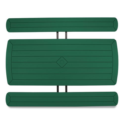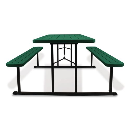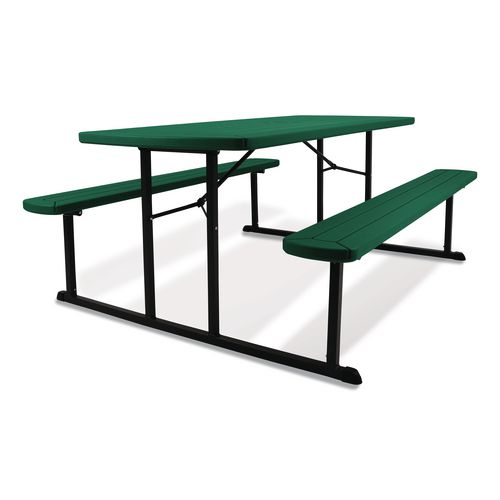 Product Details** Global Product Type Picnic Tables Top Shape Rectangular Color Family Green Maximum Weight Capacity 1,000 lbs Overall Width 57″ Height (Max) 29.5″ Base Color Black Top Color Green Top Thickness 1.6″ Overall Depth 72″ Top Material Plastic Base/Leg Material Steel Base Type (4) Folding Legs Folded Height 3″ Caster/Glide/Wheel Non-Marring Glides Product Biodegradability Indicator N Product Biodegradability in Days 0 Product Compostability Indicator N Compliance Standards LEED Applicable,MAS Certified Green Pre-Consumer Recycled Content Percent 0% Post-Consumer Recycled Content Percent 0% Total Recycled Content Percent 0% Country Of Origin CN Carton Weight 85 lbs. Carton Pack Quantity 1 EA Pack Quantity 0 UPC 604747449964 UNSPSC 56101603 Shipping Weight & Item Dimensions Weight 85 lbs. Length 32 in Height 7 in Width 76 in Warranty Manufacturer’s limited 10-year warranty.