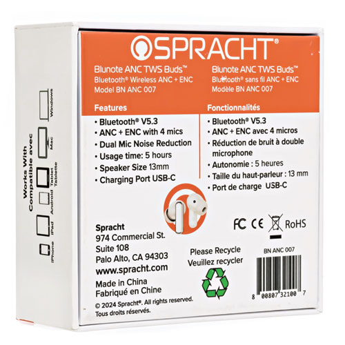 Take calls or listen to music on these super comfortable in earbuds by Spracht. Discover your portable audio sanctuary with Blunote ANC TWS Bluetooth Ear Buds. Effortlessly connect to your smartphone, tablet, or PC/Mac for a seamless wire-free experience for music and calls at your fingertips. Immerse yourself in sound with Active Noise Cancellation, which blocks external noise and is ideal for listening to music, podcasts or video. Crystal-clear calls are thanks to high-quality microphones and Environmental Noise Cancellation (ENC) technology, which filters surrounding noise for superior clarity. Bluetooth V5.3, provides a wireless range of 10 meters! Compact and stylish, these earbuds provide over five hours of talk time and the convenience of voice assistant compatibility. Recharge the case with the included Type C/USB cable. Blunote ANC TWS Bluetooth Ear Buds will Elevate your audio experience, wherever you go. Great in the office, on the road, exercising or simply relaxing at home!
