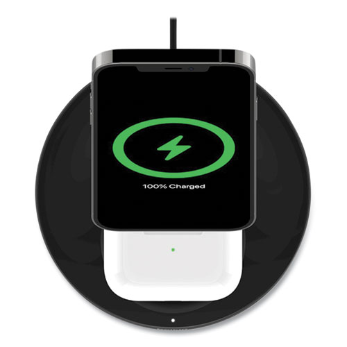 This ultra-convenient solution delivers official MagSafe® charging up to 15 W to your iPhone® in portrait or landscape. Leveraging MagSafe® technology, just place your phone on the charging stand. Below, a wireless charging pad is optimized for your AirPods®. The architecturally inspired design fits perfectly in any space, from office to living room.