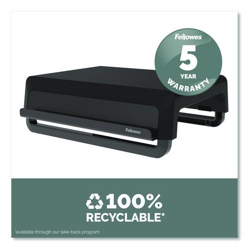 Product Details** Global Product Type Desktop Monitor Stands Workstation Type Mobile Workstation,Traditional Desk/Table Monitors Accommodated 1 Color Family Black Number of Drawers 0 Series Name Fellowes® Breyta Width (Max) 13.94″ Depth (Max) 11.97″ Height (Min) 3.25″ Height (Max) 6″ Weight Capacity 33 lbs Color(s) Black Material(s) ABS Product Biodegradability Indicator N Product Biodegradability in Days 0 Product Compostability Indicator N Pre-Consumer Recycled Content Percent 0% Post-Consumer Recycled Content Percent 0% Total Recycled Content Percent 0% Country Of Origin CN Carton Weight 7 lbs. Carton Pack Quantity 2 EA Pack Quantity 0 UPC 043859801923 UNSPSC 43212002 Shipping Weight & Item Dimensions Weight 2.86 lbs. Length 3.74 in Height 12.48 in Width 14.65 in Warranty Manufacturer’s limited five-year warranty.