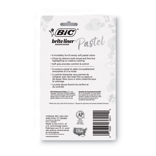 Product Details** Global Product Type Stick Highlighters Highlighter Style Pen Color Family Multicolor Highlighter Tip Type Chisel Highlighters Erasable Ink No Retractable No Pocket Clip Indicator Yes Highlighter Ink Color Assorted Highlighter Ink Color Assortment Pastel Blue,Pastel Green,Pastel Orange,Pastel Pink,Pastel Purple,Pastel Yellow Highlighter Barrel Color Assorted Highlighter Barrel Color Assortment Pastel Blue/Black/Silver,Pastel Green/Black/Silver,Pastel Orange/Black/Silver,Pastel Pink/Black/Silver,Pastel Purple/Black/Silver,Pastel Yellow/Black/Silver Grip Type Rubberized Product Biodegradability Indicator N Product Biodegradability in Days 0 Product Compostability Indicator N Pre-Consumer Recycled Content Percent 0% Post-Consumer Recycled Content Percent 0% Total Recycled Content Percent 0% Country Of Origin US Carton Weight 7 lbs. Carton Pack Quantity 36 PK Pack Quantity 6 EA UPC 070330364110 UNSPSC 44121716 Shipping Weight & Item Dimensions Weight 0.18 lbs. Length 7.63 in Height 4.63 in Width 0.7 in