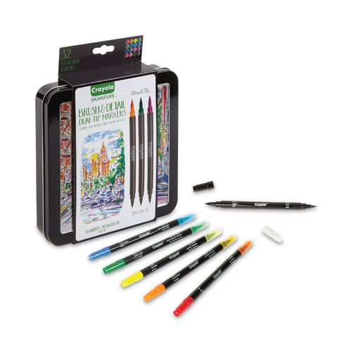 Customize your writing, drawing, and coloring with Crayola signature brush and detail dual-tip markers. Each dual-tip marker features a brush tip and an ultra-fine tip and delivers two vibrant complementary colors for twice the versatility and double the coloring fun. Perfect for artists of any age, the dual-ended markers come in a decorative tin that helps ensure they stay in pristine condition between uses. Sketch, write, draw, and blend colors with the versatile Crayola signature brush and detail dual-tip markers. Makes a great creative holiday or birthday gift for crafters.