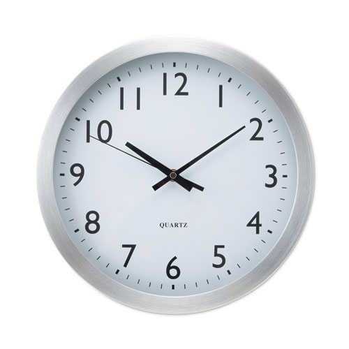 This brushed aluminum wall clock comes with a brushed steel finish on the wide profile aluminum frame. This look makes the clock’s large, bold numbers on the face allow for extra clarity and easy readability of the clock. Quartz movement ensures accurate timekeeping. Common clock diameter size makes this clock suitable for various wall spaces in offices, schools, homes and more.