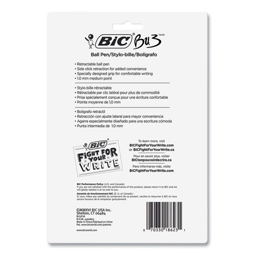 Product Details** Global Product Type Ballpoint Pens Pen Style Retractable Pen Tip Type Conical Pen Point Size Type Medium Color Family Black Erasable Ink No Refillable No Pen Sub-Brand & Product Family BU3 Pen Type Ballpoint Pen Pen Point Size 1 mm Pen Ink Color(s) Black Pen Barrel Color(s) Smoke/Black Airplane-Safe Ink Yes Low-Viscosity Ink No Pen Grip Type Rubber Visible Ink Supply Yes Pocket Clip Indicator Yes Product Biodegradability in Days 0 Pre-Consumer Recycled Content Percent 0% Post-Consumer Recycled Content Percent 0% Total Recycled Content Percent 0% Country Of Origin CN Carton Weight 13 lbs. Carton Pack Quantity 24 PK Pack Quantity 18 EA UPC 070330531178 UNSPSC 44121704 Shipping Weight & Item Dimensions Weight 0.502 lbs. Length 8.175 in Height 1.375 in Width 5.592 in