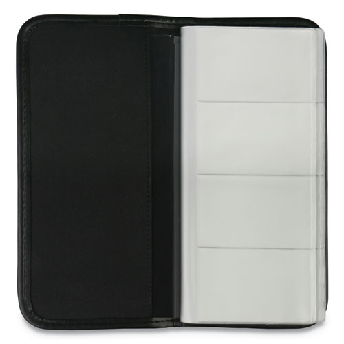 This business card holder gives you a stylish and convenient way to carry your business cards (and credit cards too). Sleek modern leather-like, padded vinyl cover gives professionalism and style to the product. Four card-high clear pages keep your cards in pristine condition. Inside front pocket allows for personal card storage. Holds up to 160 cards, enough space for a large selection of your cards.