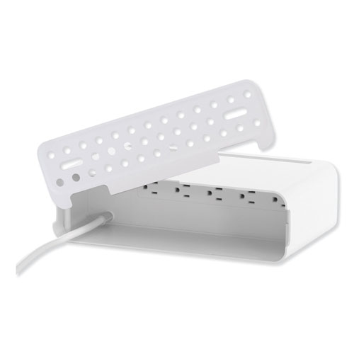 Integrated power strip with spacious internal compartment to organize power cords to reduces clutter and dangling wires. Connect and control up to five devices individually: computer, printer, phone, tablet, monitor, speakers, small home appliances, etc. Elegant compact design; sturdy construction for use as a monitor stand and/or tablet and phone stand. Three USB charging ports (Output 5V, 3.1A). Includes 30 preprinted and blank labels for use to identify each individual switch, as well as master power switch.