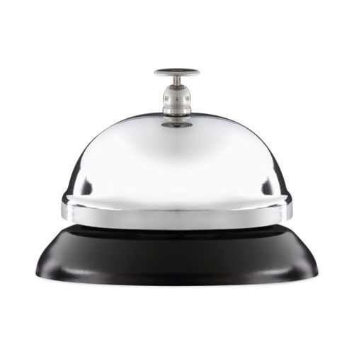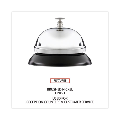 Attention grabbing bell to alert staff when customers or clients arrive at the counter and need assistance. Easy to push bell that emits a clean, clear, distinguishing tone when pushed. Sleek, modern style features a nickel-plated bell with black base. Great for reception counters and customer service areas where people need service and can alert staff with a simple ring.