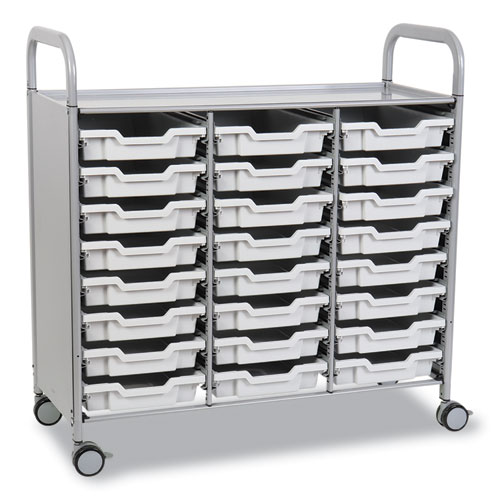 Product Details** Global Product Type Classroom Activity & Storage Carts Overall Material Type Metal Color Family Gray Caster/Wheel Indicator Yes Number of Shelves 1 Bin Quantity 24 Material(s) Polypropylene,Steel Color(s) Silver/Light Gray Overall Width 40.6″ Overall Depth 17.3″ Height (Max) 41.5″ Work Surface Height 37.5″ Number of Wheels 4 Caster/Wheel Size 3″ Wheel Type (2) Locking Swivel,(2) Non-Locking Swivel Caster/Wheel Material Plastic Ground Clearance 4″ Handle Quantity 2 Shelf Type(s) Fixed Bin Color(s) Light Gray Bin Width 12.28″ Bin Depth 16.81″ Bin Height 3.25″ Bin Capacity (Volume) 1.85 gal Bin Capacity (Weight) 11 lb Compartment Handle(s) 24 Lock No Power Management Indicator No Compact Storage Indicator No For Use With Gratnells F1 Shallow Trays, F2 Deep Trays Product Biodegradability Indicator N Product Biodegradability in Days 0 Product Compostability Indicator N Package Includes (24) Light Gray F1 Shallow Trays,(2) Locking Swivel Casters,(2) Non-Locking Swivel Casters,(4) Stationary Shelving Glides Pre-Consumer Recycled Content Percent 0% Post-Consumer Recycled Content Percent 0% Total Recycled Content Percent 0% Special Features Set 03: 24 F1 Shallow Bins Country Of Origin GB Carton Weight 93 lbs. Carton Pack Quantity 1 ST Pack Quantity 1 EA UPC 000000000000 UNSPSC 24101501 Shipping Weight & Item Dimensions Weight 93 lbs. Length 44 in Height 20 in Width 20 in Warranty Manufacturer’s limited five-year warranty.