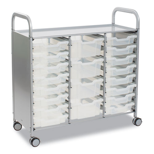 Product Details** Global Product Type Classroom Activity & Storage Carts Overall Material Type Metal Color Family Clear Caster/Wheel Indicator Yes Number of Shelves 1 Bin Quantity 20 Material(s) Polypropylene,Steel Color(s) Silver/Translucent Frost Overall Width 40.6″ Overall Depth 17.3″ Height (Max) 41.5″ Work Surface Height 37.5″ Number of Wheels 4 Caster/Wheel Size 3″ Wheel Type (2) Locking Swivel,(2) Non-Locking Swivel Caster/Wheel Material Plastic Ground Clearance 4″ Handle Quantity 2 Shelf Type(s) Fixed Bin Color(s) Translucent Frost Bin Width 12.28″ Bin Depth 16.81″ Bin Height Assorted Bin Capacity (Volume) Assorted Bin Capacity (Weight) 11 lb Compartment Handle(s) 20 Lock No Power Management Indicator No Compact Storage Indicator No For Use With Gratnells F1 Shallow Trays, F2 Deep Trays Product Biodegradability Indicator N Product Biodegradability in Days 0 Product Compostability Indicator N Package Includes (16) Translucent Frost F1 1.85 gal Capacity 3.25″ Shallow Trays,(4) Translucent Frost F2 3.57 gal Capacity 6.25″ Deep Trays,(2) Locking Swivel Casters,(2) Non-Locking Swivel Casters,(4) Stationary Shelving Glides Pre-Consumer Recycled Content Percent 0% Post-Consumer Recycled Content Percent 0% Total Recycled Content Percent 0% Special Features Set 17: 16 F1 Shallow Bins and 4 F2 Deep Bins Country Of Origin GB Carton Weight 95 lbs. Carton Pack Quantity 1 ST Pack Quantity 1 EA UPC 000000000000 UNSPSC 24101501 Shipping Weight & Item Dimensions Weight 95 lbs. Length 44 in Height 20 in Width 20 in Warranty Manufacturer’s limited five-year warranty.