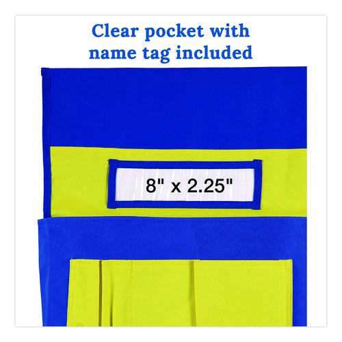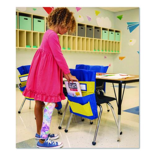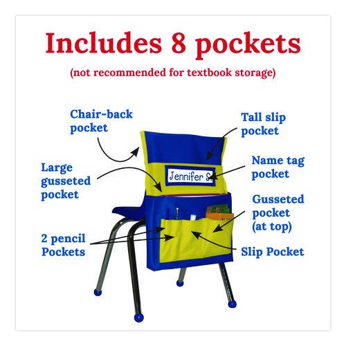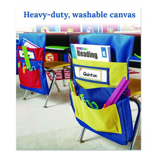 From workbooks to writing instruments, the Chairback Buddy™ makes it easy for students to store and organize their school supplies. Ideal for elementary schools, preschools, daycares and more, this classroom-chair pocket-organizer effortlessly slips right over a standard student chair’s back, and its name tag pocket (name tag insert included) helps students customize and take ownership of their very own Buddy. Each organizer features a range of pockets in several sizes to accommodate pens, pencils, crayon sets, calculators, folders, composition books, rulers and more. Colorful, attractive and ultra-durable, each pocket organizer is constructed of heavy-duty, flame-retardant, washable PVC-coated canvas to ensure excellent results even after heavy, long-term use.
