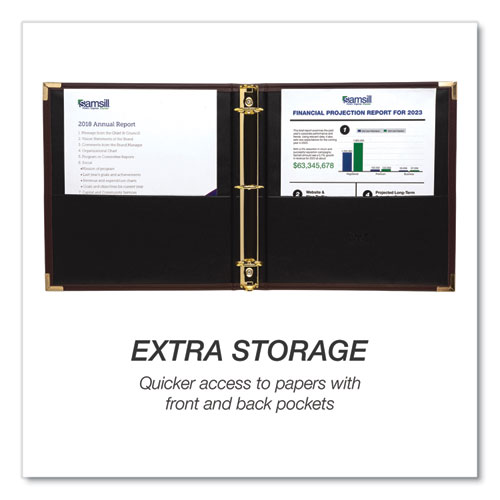 Get ready for a big business meeting or simply stand up to the task of daily work. Coming from the exclusive Classic Collection® of executive binders, this corporate binder combines the highest grade of workmanship with premium-quality materials. Featuring an upscale traditional styling, it includes eye-catching accents, a curved spine and concealed-rivet construction for a smart and truly professional appeal. The luxurious texture of the leather-like exterior is complemented with sewed edges for an extra touch of elegance, while the metallic brass plating of the metal rings matches the corner edges for a stylish, professional appeal. Two inside pockets allow you to store and organize your important documents, unpunched sheets and other office supplies. Heavy-duty O-rings allow you to securely store and organize documents, pamphlets, samples or giveaways, while making it easy to turn the pages. Designed to meet a variety of needs, it can be used as an interview binder, resume binder, presentation binder, planner binder or legal binder, and it’s a popular choice among investment advisers, advocates, real estate professionals and anyone working with high-value clients.