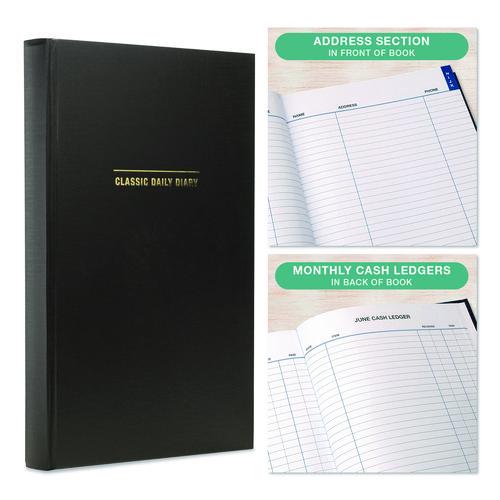 Product Details** Global Product Type Appointment Book/Personal Organizers Dated Yes Academic Year No Calendar Format Daily Edition Year 2025 Calendar Term 12-Month (Jan to Dec) Binding Type Sewn Color Family Black Refillable No Calendar Spread Format One Day per Page Julian Dates Yes Size (Bound-Side First) 12.5 x 8 Binding Details Casebound: Hard Cover Cover Color(s) Black/Gold Cover Material(s) Fabric,Heavyweight Carboard Appointment Ruling Open Scheduling Separate Sections Cash Ledger,Contacts Sheet Color(s) Ivory Reversible No Product Biodegradability Indicator N Product Biodegradability in Days 0 Product Compostability Indicator N Pre-Consumer Recycled Content Percent 0% Post-Consumer Recycled Content Percent 0% Total Recycled Content Percent 0% Country Of Origin CN Carton Weight 30 lbs. Carton Pack Quantity 8 EA Pack Quantity 0 UPC 840312310240 UNSPSC 44112004 Shipping Weight & Item Dimensions Weight 3.606 lbs. Length 13.127 in Height 1.42 in Width 8.24 in