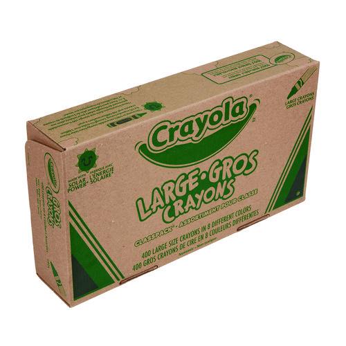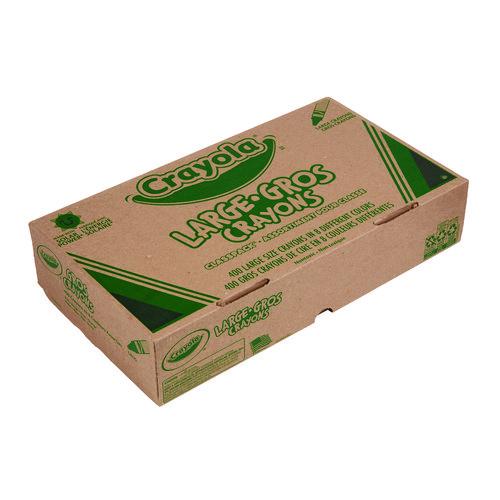 Product Details** Global Product Type Wax Crayons Color Family Multicolor Size Group Large Age Recommendation Ages 4 and up Crayon Size 4″ × 0.44″ Color(s) Assorted Color Assortment Black,Blue,Brown,Green,Orange,Red,Violet,Yellow Temp. Range Soften at 105° F,Melt at 128° F Product Biodegradability in Days 0 Compliance Standards ACMI AP Non-Toxic Certified,Conforms to ASTM D 4236 Pre-Consumer Recycled Content Percent 0% Post-Consumer Recycled Content Percent 0% Total Recycled Content Percent 0% Special Features Large Crayons, 50 of each color Country Of Origin US Carton Weight 11 lbs. Carton Pack Quantity 400 EA Pack Quantity 0 UPC 071662980382 UNSPSC 44121709 Shipping Weight & Item Dimensions Weight 11 lbs. Length 3.5 in Height 16.5 in Width 9.31 in