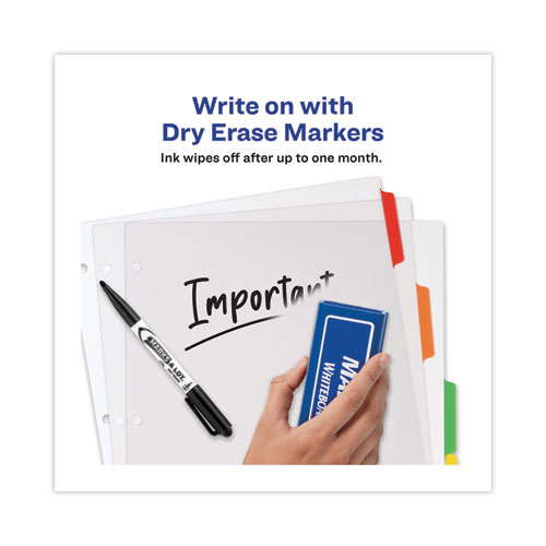 These clear, easy view durable plastic dividers let you easily create or update your section titles with no tab inserts or labels needed. The 3-ring binder dividers and sheet protector work together to provide a clean, professional look and the flexibility to easily make changes or reuse your page dividers again and again. Just print your section titles on a plain sheet of paper and insert the sheet into the included sheet protector. Place the sheet protector in the back of your binder and the clear plastic dividers allow you to see your section titles below. Our free templates on the Avery site let you easily customize the section titles for your divider tabs in minutes. When you need to make a change or reuse your dividers, simply update the template and print a replacement sheet. The tabs are also writeable with a pen, pencil or marker, while Avery Dry Erase Marker ink can erase off the divider and sheet protector after up to one month. The extra durable, tear-resistant plastic wipes clean with most non-abrasive household cleaners.