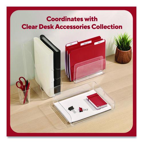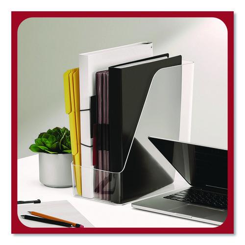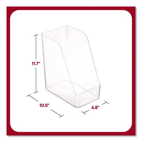 Maximize space at your desk with this TRU RED™ jumbo clear magazine file. Arrange books, folders and other important documents. A wide design allows for a bulk storage and organization solution. This TRU RED™ jumbo clear magazine file coordinates with other TRU RED™ desk accessories, so you can create a customized organization system.