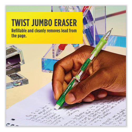 Product Details** Global Product Type Mechanical Pencils Retractable Yes Eraser (Yes/No) Yes Color Family Black Numeric Graphite Scale #2 HB Graphite Scale HB Refillable Yes Graphite Color(s) Black Pencil Barrel Color(s) Randomly Assorted Pencil Barrel Color Assortment Black,Blue,Green,Purple,Rose Pencil Barrel Material Plastic Pencil Grip Type Textured Rubber Graphite Diameter 0.7 mm Pocket Clip Indicator Yes Mechanical Pencil Advance Type Side-Advance Mechanical Pencil Sleeve Type Sliding Sleeve Product Biodegradability Indicator N Product Biodegradability in Days 0 Product Compostability Indicator N Package Includes (1) Tube of (12) 0.7 mm HB (#2) Leads,(2) Refill Erasers Compliance Standards Box Tops for Education Pre-Consumer Recycled Content Percent 0% Post-Consumer Recycled Content Percent 0% Total Recycled Content Percent 0% Disclaimer Statement Barrel color is randomly assigned when shipped-item may not ship as shown. Country Of Origin JP Carton Weight 5 lbs. Carton Pack Quantity 48 ST Pack Quantity 2 EA UPC 071641560475 UNSPSC 44121705 Shipping Weight & Item Dimensions Weight 0.098 lbs. Length 7.63 in Height 0.75 in Width 3.25 in