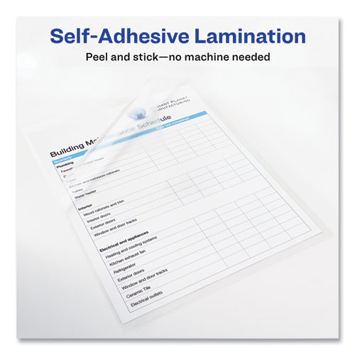 Easily, quickly and inexpensively laminate important documents, precious photos, valuable cards and more using these clear self-laminating sheets. Each laminate sheet is coated with permanent self-adhesive so you can effortlessly create professional quality laminations without having to fuss with lamination machines. Laminating is simple: use the included grid to size the document, place the document on the adhesive side of a laminating sheet, lay the second sheet with its adhesive side down to seal the other side of the document and trim the edges. Made from acid-free and archival safe material, you’ll be able to preserve and protect documents, diplomas, artwork, photos, collector cards, signs, homemade crafts, stickers and more. You can even turn your laminated sheets into a dry erase board and use a dry erase marker to make notes on them directly. Whether you’re a business professional, teacher, student, hobbyist or collector, you’ll love how easy-to-use and inexpensive Avery lamination sheets are for all your quick laminating projects.