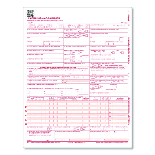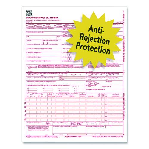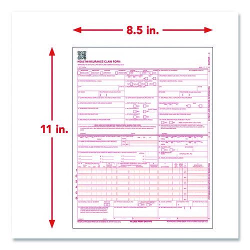 Product Details** Global Product Type Insurance Forms Form Type Details CMS-1500 Dated No Forms Per Page 1 Format Indicator Unbound Copy Types One-Part (No Copies) Color Family White Form Size 8.5 x 11 Sheet Size 8.5 x 11 Form Quantity (Total) 250 Principal Heading(s) 1500 Health Insurance Claim Form Paper Color(s) White Print and Ruling Color(s) OCR Red Product Biodegradability Indicator N Product Biodegradability in Days 0 Product Compostability Indicator N Pre-Consumer Recycled Content Percent 0% Post-Consumer Recycled Content Percent 0% Total Recycled Content Percent 0% Country Of Origin US Carton Weight 21 lbs. Carton Pack Quantity 2 PK Pack Quantity 250 EA UPC 758399422254 UNSPSC 14111806 Shipping Weight & Item Dimensions Weight 2.598 lbs. Length 11.224 in Height 1.29 in Width 8.714 in
