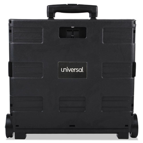 Ideal for transporting bulky items with ease in just one trip. High capacity (1.7 cu ft) rolling crate with built-in telescoping handle. Collapses flat to 3.5″ for easy storage; opens in seconds. Includes support rails for additional durability and carrying grips on all sides for lifting. Lightweight, extremely durable plastic frame. Two non-marring wheels. Supports up to 60 lbs.