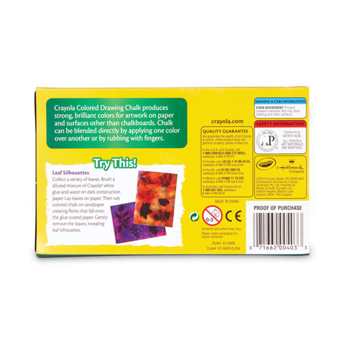 Product Details** Global Product Type Artist’s Chalk Age Recommendation Ages 4 and Up Number of Colors 12 Color(s) Assorted Length 3.19″ Diameter 0.38″ Product Biodegradability Indicator N Product Biodegradability in Days 0 Product Compostability Indicator N Compliance Standards ACMI AP Non-Toxic Certified,Conforms to ASTM D 4236 Pre-Consumer Recycled Content Percent 0% Post-Consumer Recycled Content Percent 0% Total Recycled Content Percent 0% Country Of Origin ID Carton Weight 12 lbs. Carton Pack Quantity 72 ST Pack Quantity 12 EA UPC 071662004033 UNSPSC 44121710 Shipping Weight & Item Dimensions Weight 0.266 lbs. Length 5.44 in Height 3.5 in Width 0.72 in