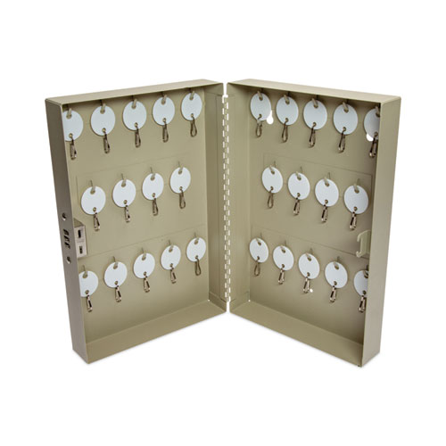 Strong and lighweight design allows for key tags to be easily attached to the items. Cabinet can be used to store car keys, locker keys and any other keys that do not have a fob. Keeps keys easily accessible in one location. Keys are kept safe and secure with combination lock on cabinet. Perfect for banks, offices, storage facilities and car keys. Wall mountable.