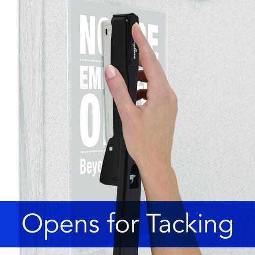 Turn to the Commercial Desk Stapler when you need durable, long-lasting stapling integrity. Metal construction and a 20 sheet stapling capacity makes this stapler a great candidate for heavy, daily use. Positive locking latch is included to hold staples securely in magazine. Provides both tacking and pinning functionality. The stapler opens flat for tacking to a vertical surface and has an anvil that rotates to create a temporary pin staple.